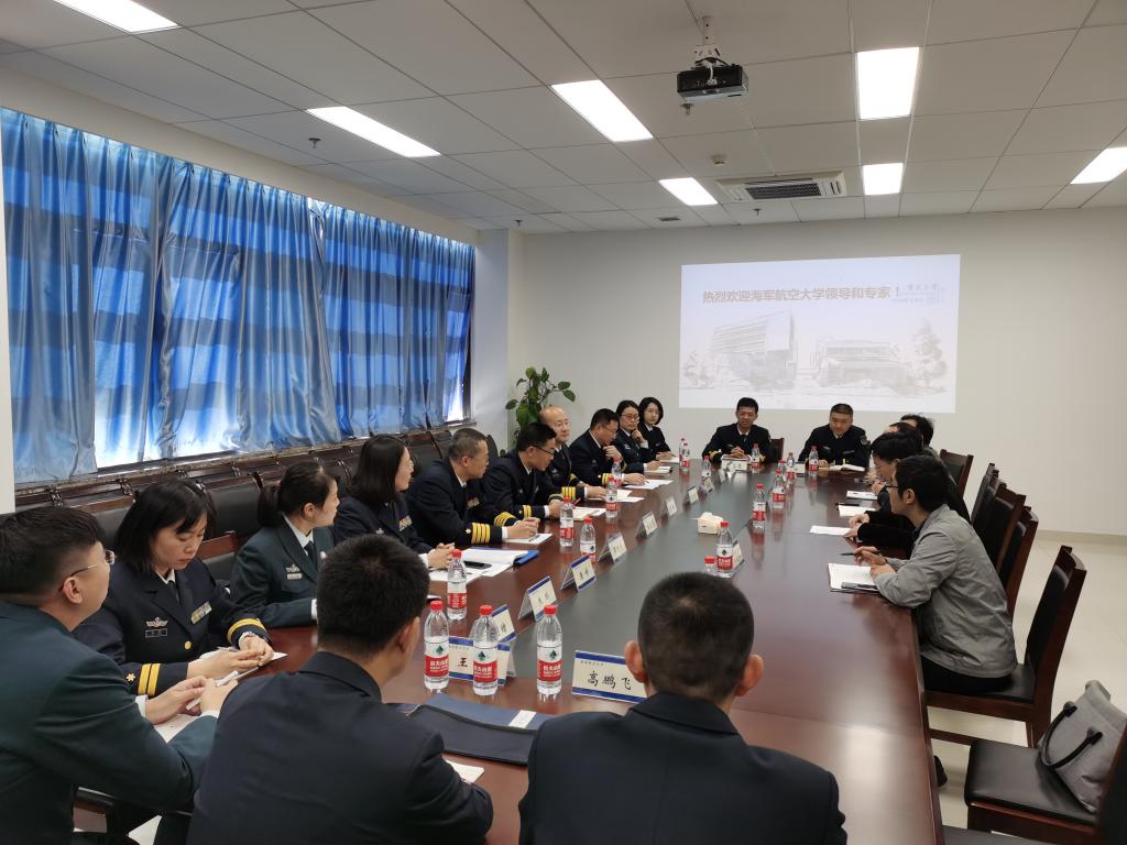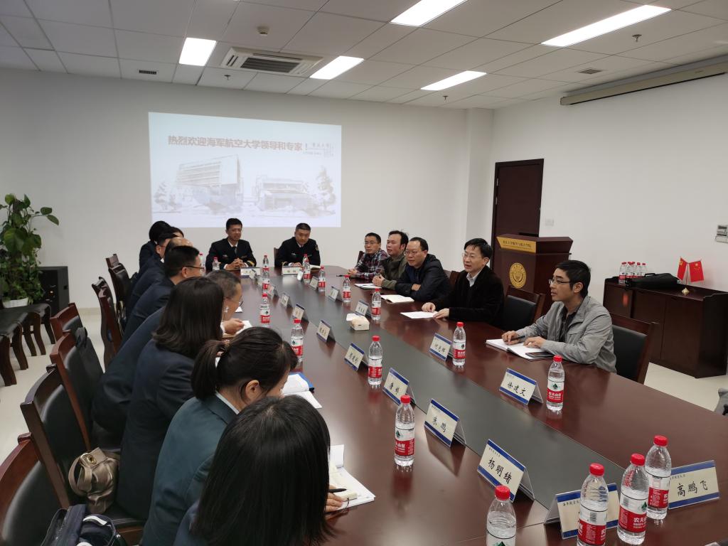 调研课程思政建设工作的海军航空大学青岛校区教学科研处杨霄副处长、教学考评中心主任张晓东教授、航空机械工程与指挥系张泰峰主任等一行专家举行了座谈会。